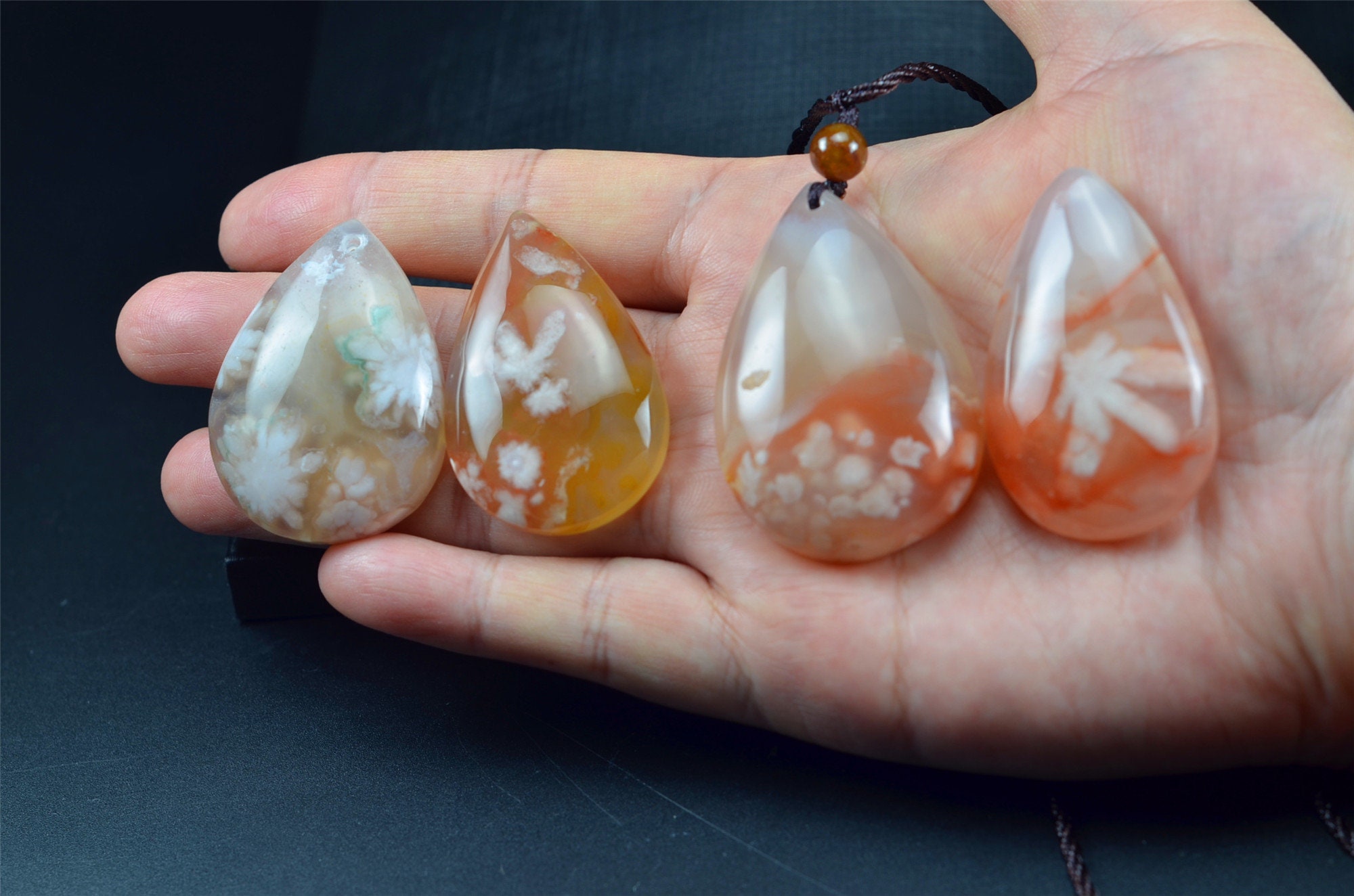 Carved into a graceful teardrop shape, this pendant combines elegance with symbolic meaning. Often associated with growth, transformation, and emotional healing, cherry blossom agate is cherished as both a beautiful accessory and a spiritual stone.