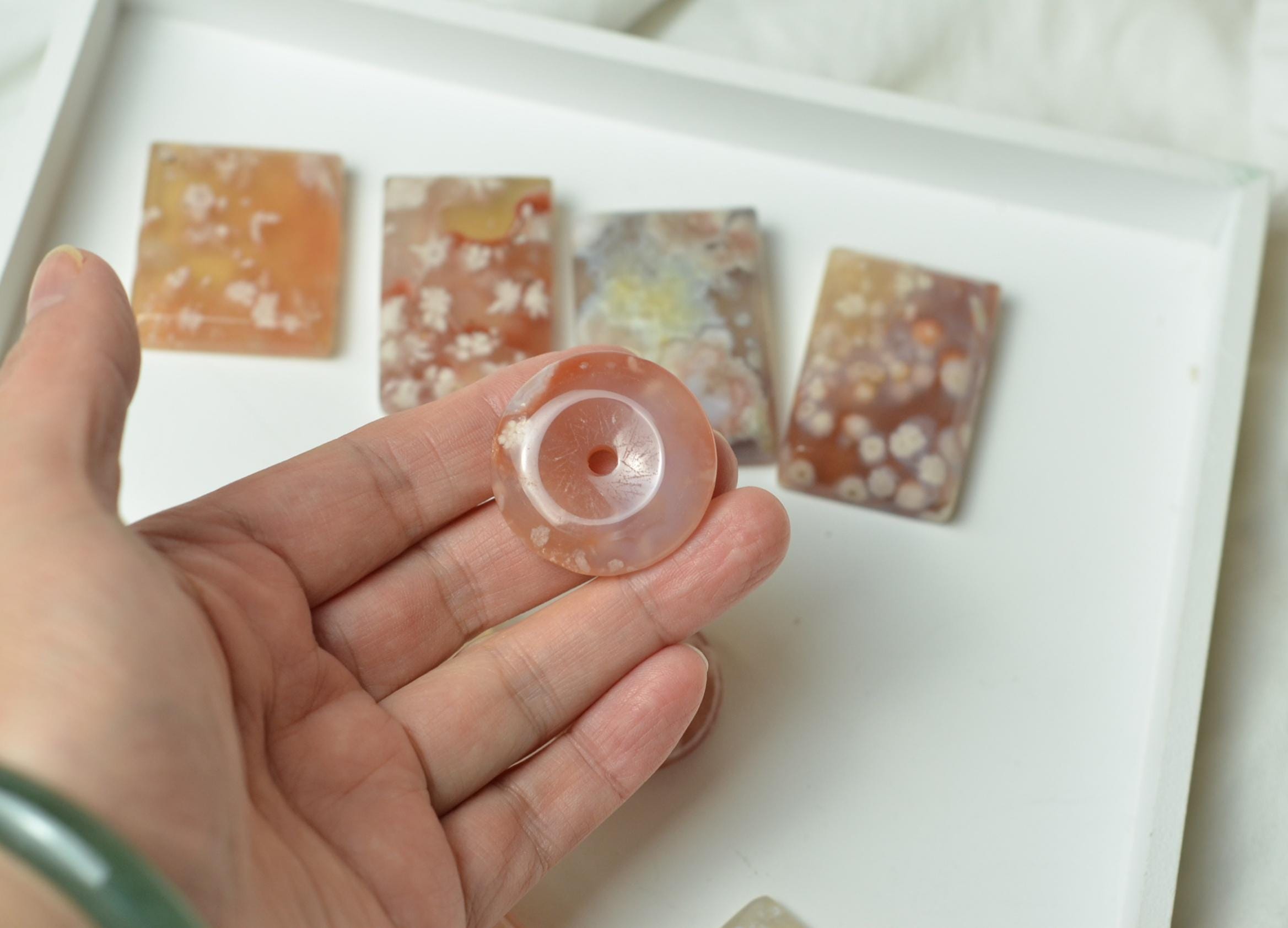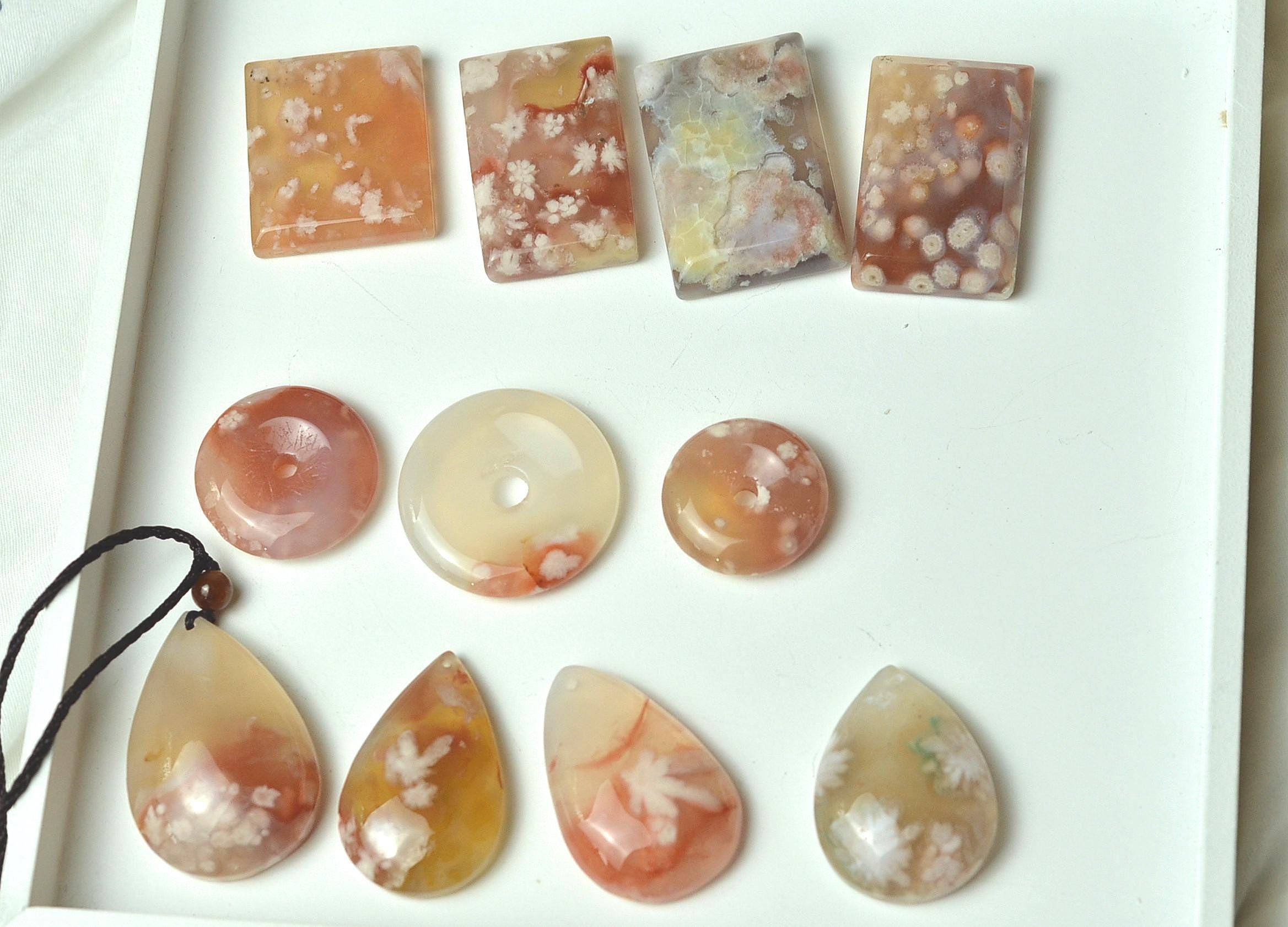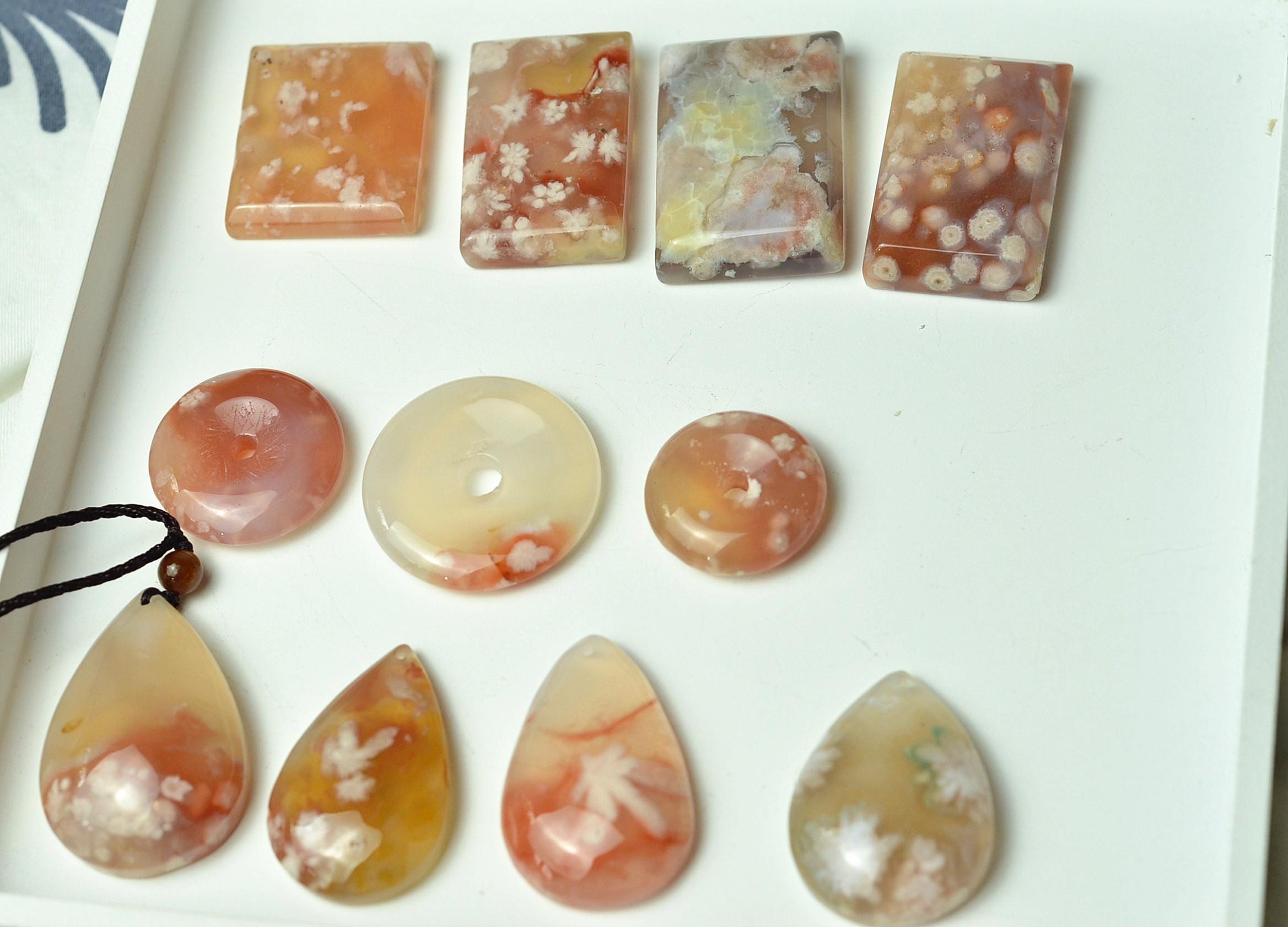 Experience the gentle beauty of nature with this enchanting cherry blossom agate pendant, inspired by the soft bloom of sakura flowers. Carefully selected from Madagascar, this natural agate showcases delicate pink, white, and translucent tones that resemble blossoms floating within the stone.