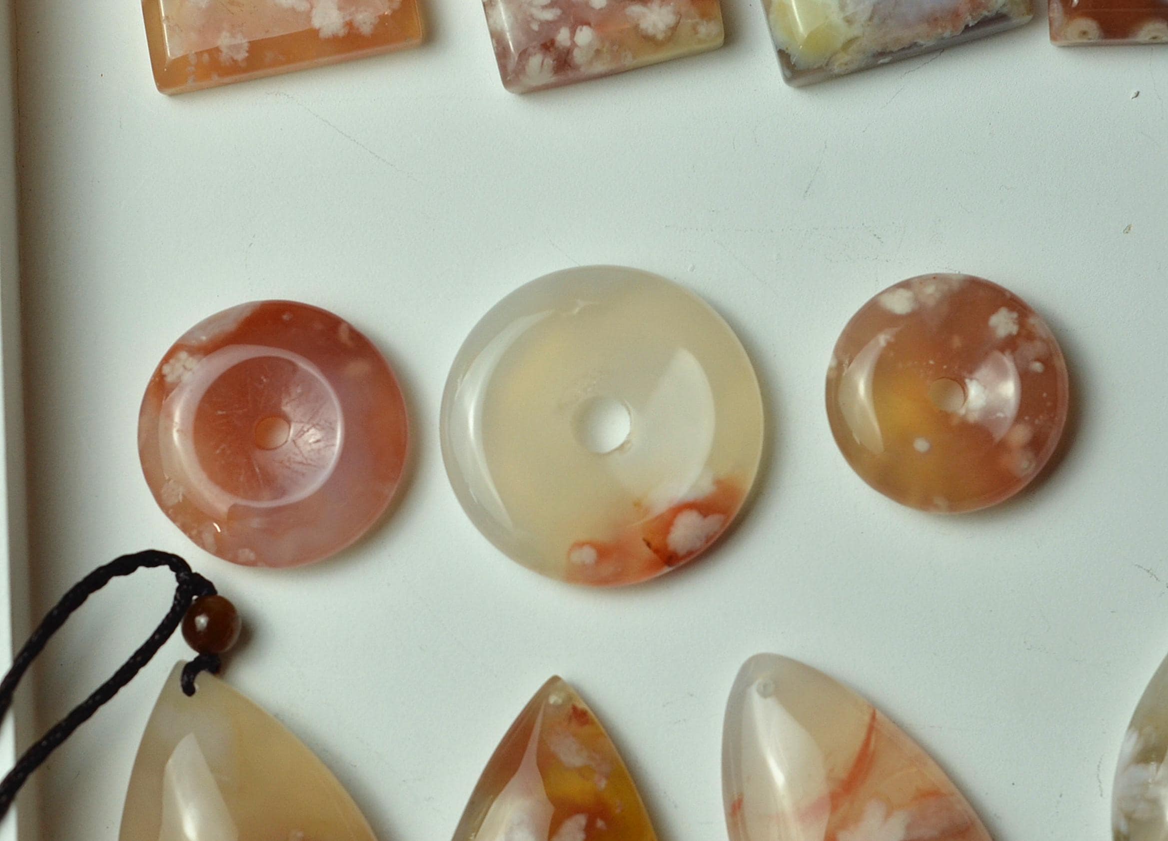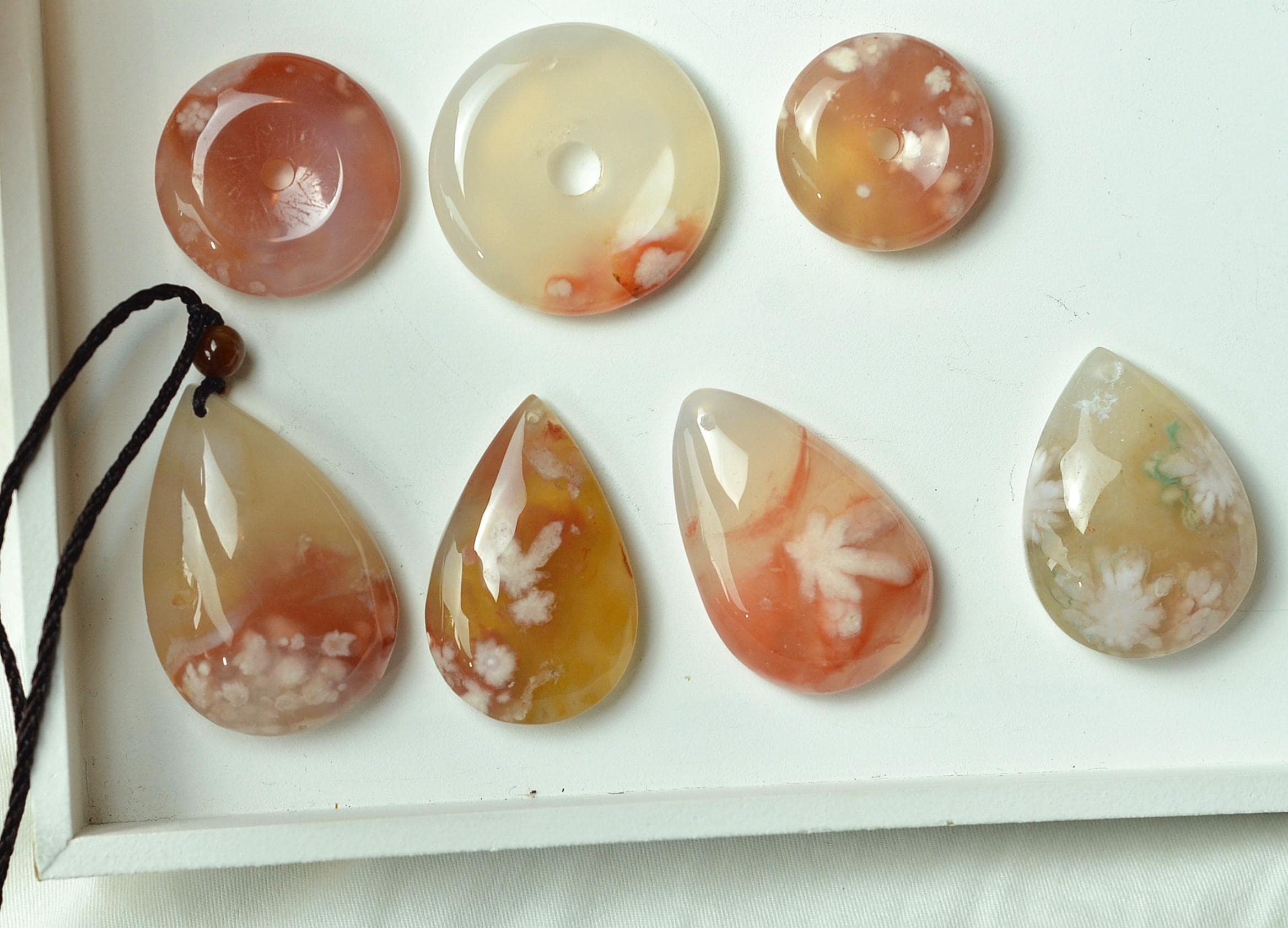 Natural cherry blossom agate pendant from Madagascar, featuring soft pink and white tones in an elegant teardrop shape. A unique and meaningful gemstone piece, perfect for everyday wear or spiritual connection.