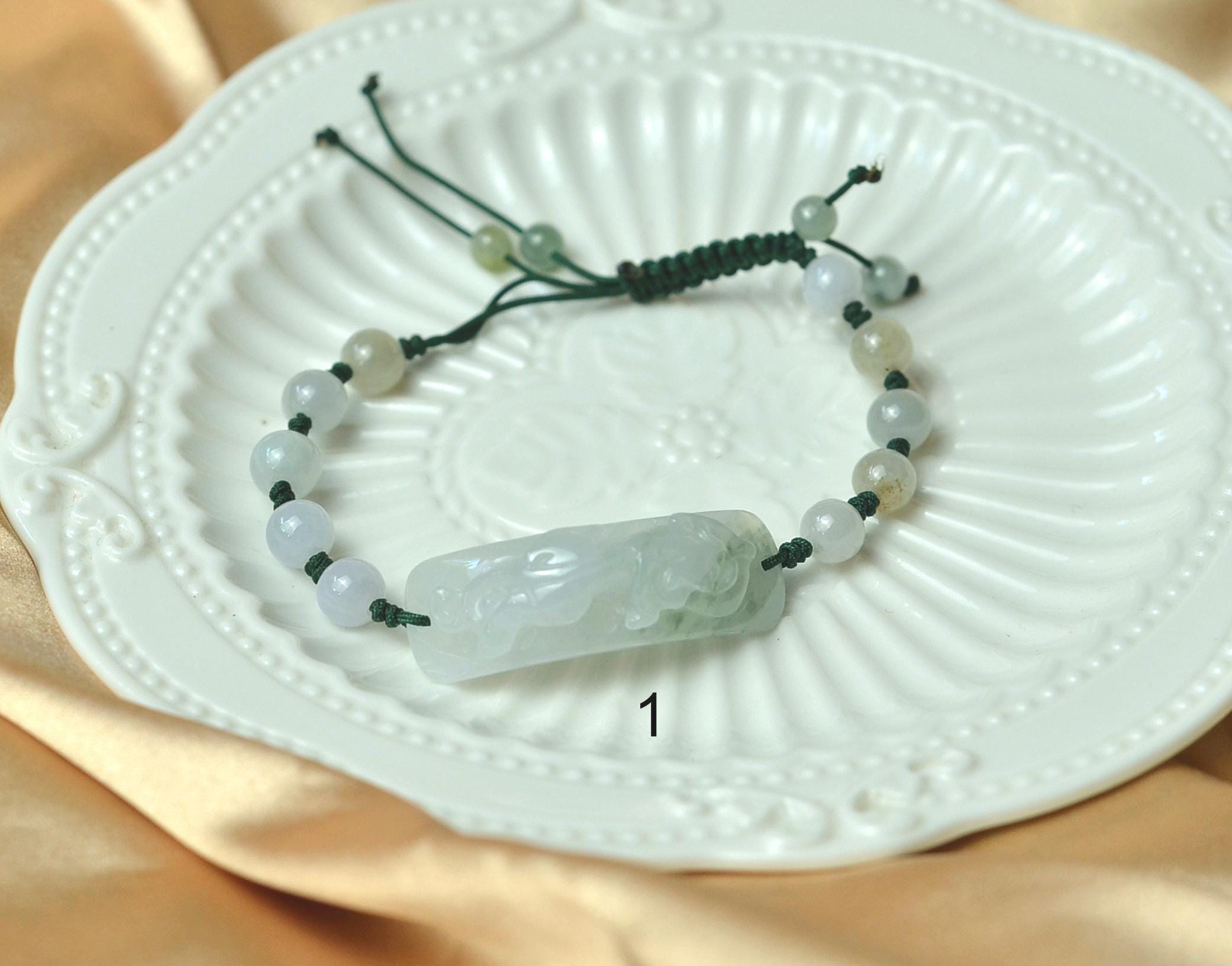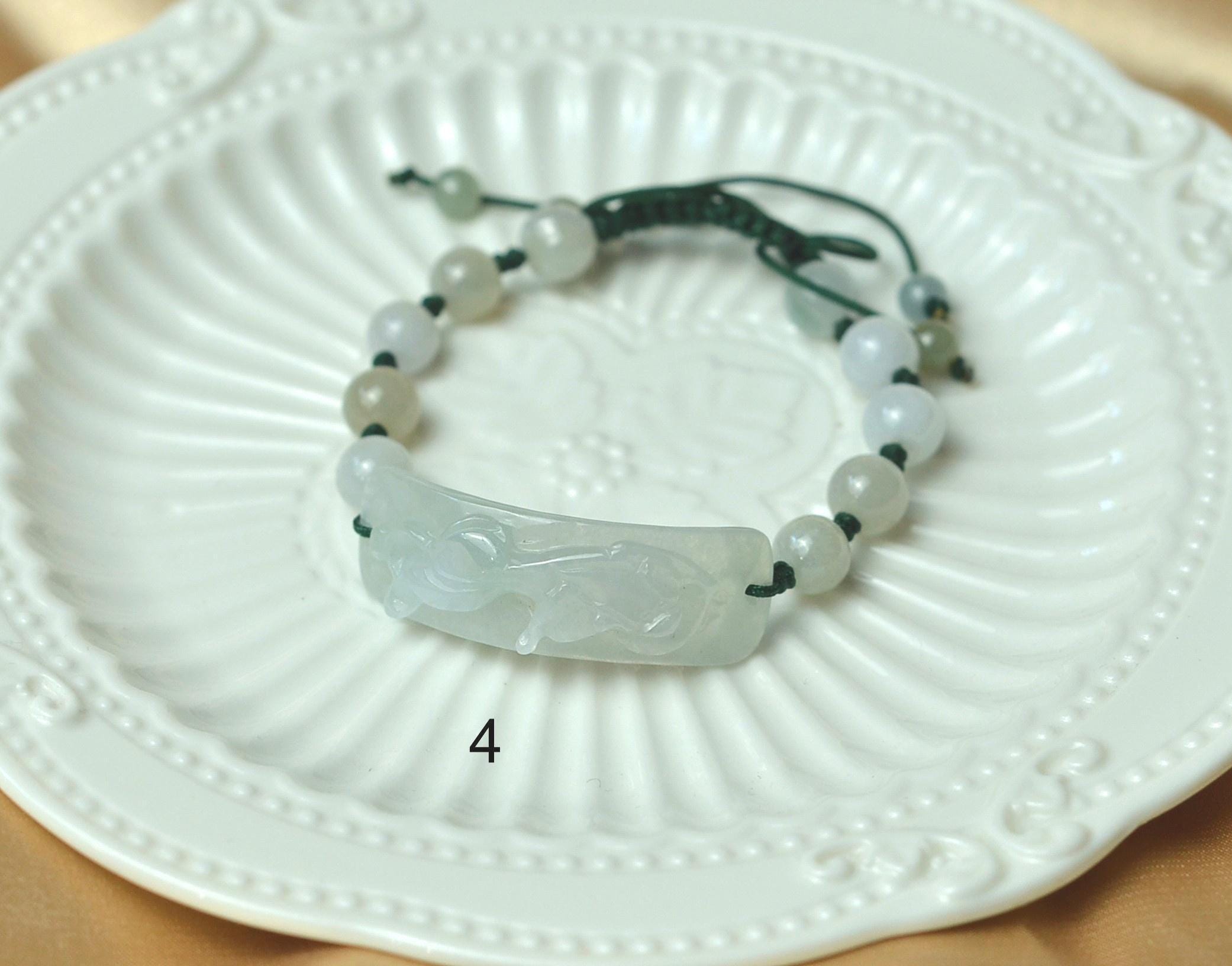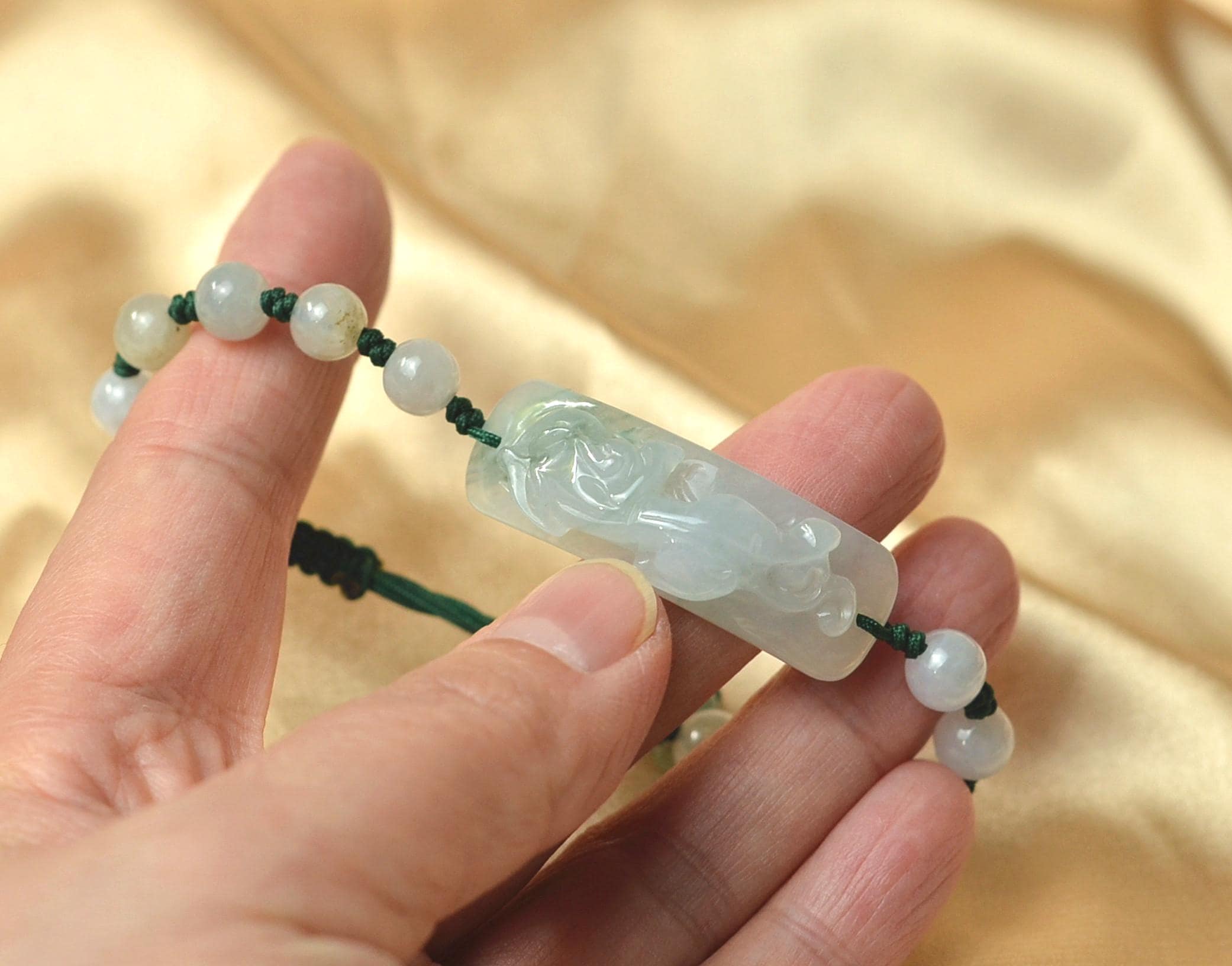 This refined jade bracelet features a beautifully carved centerpiece, complemented by smooth jade beads and a durable adjustable cord. The intricate carving highlights skilled craftsmanship, while the soft jade tones add a sense of calm and elegance.