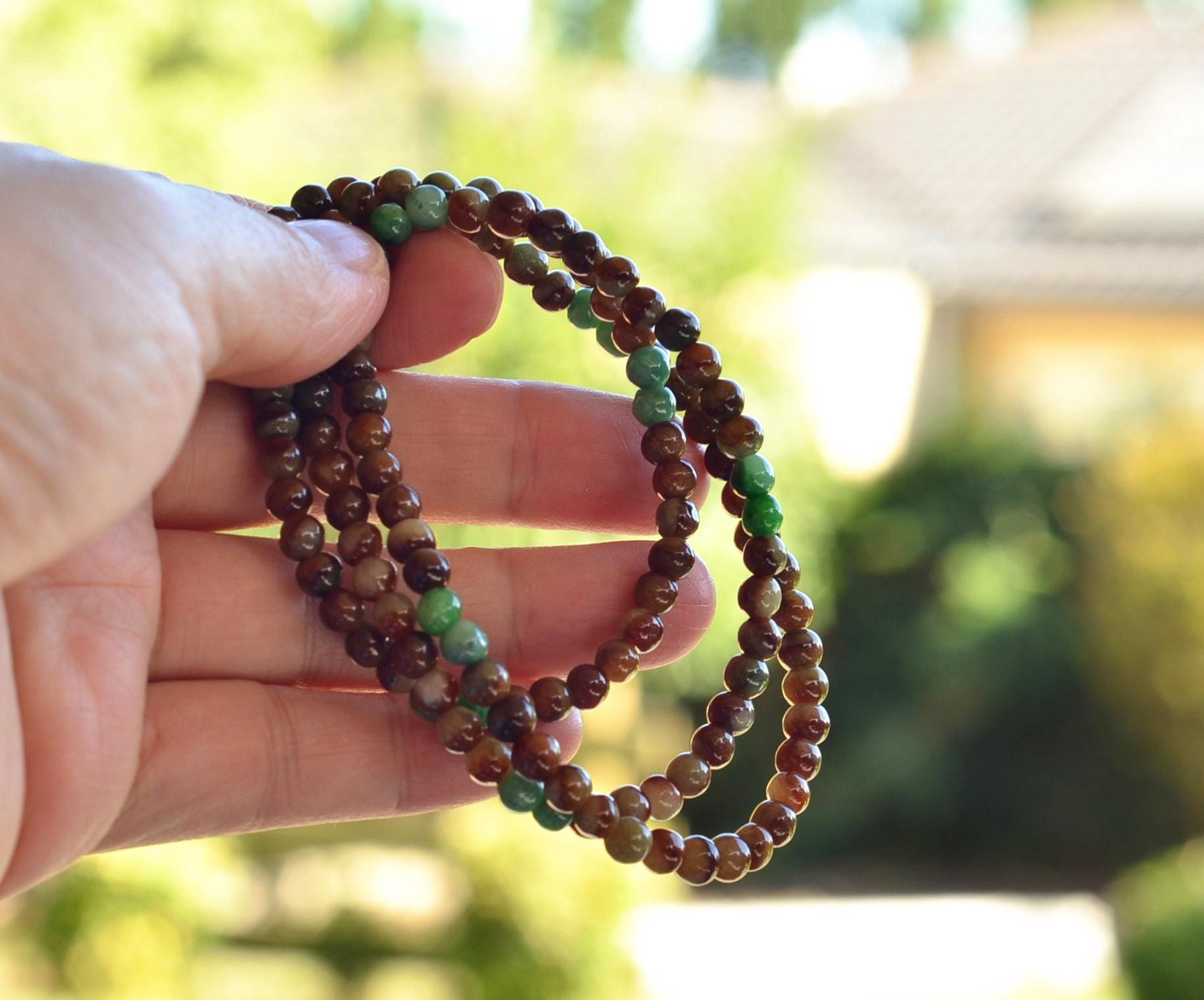This delicate bracelet is made from natural jadeite beads in beautiful, earthy, multicolored tones, including warm brown, soft green, and subtle translucent shades. The natural variation in color gives the bracelet a unique and organic appearance.