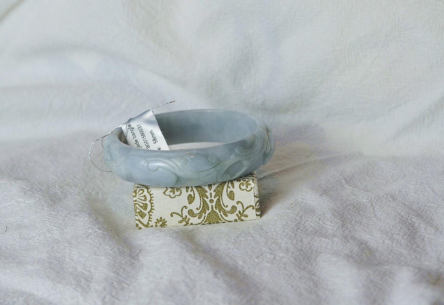 This beautiful jadeite bangle is crafted from natural, untreated Grade A jadeite. The bangle features a traditional Ruyi pattern carving, symbolizing good fortune, prosperity, and fulfilled wishes. The elegant carving adds cultural meaning while maintaining a timeless, refined look.